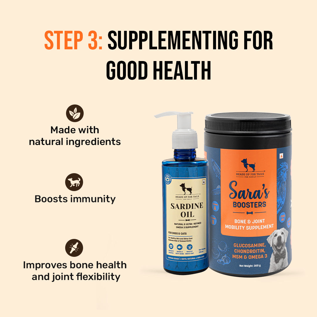 - HUFT Sardine Oil (200 ml): Rich in omega-3 & 6 fatty acids to promote endurance, joint comfort & a shiny coat.