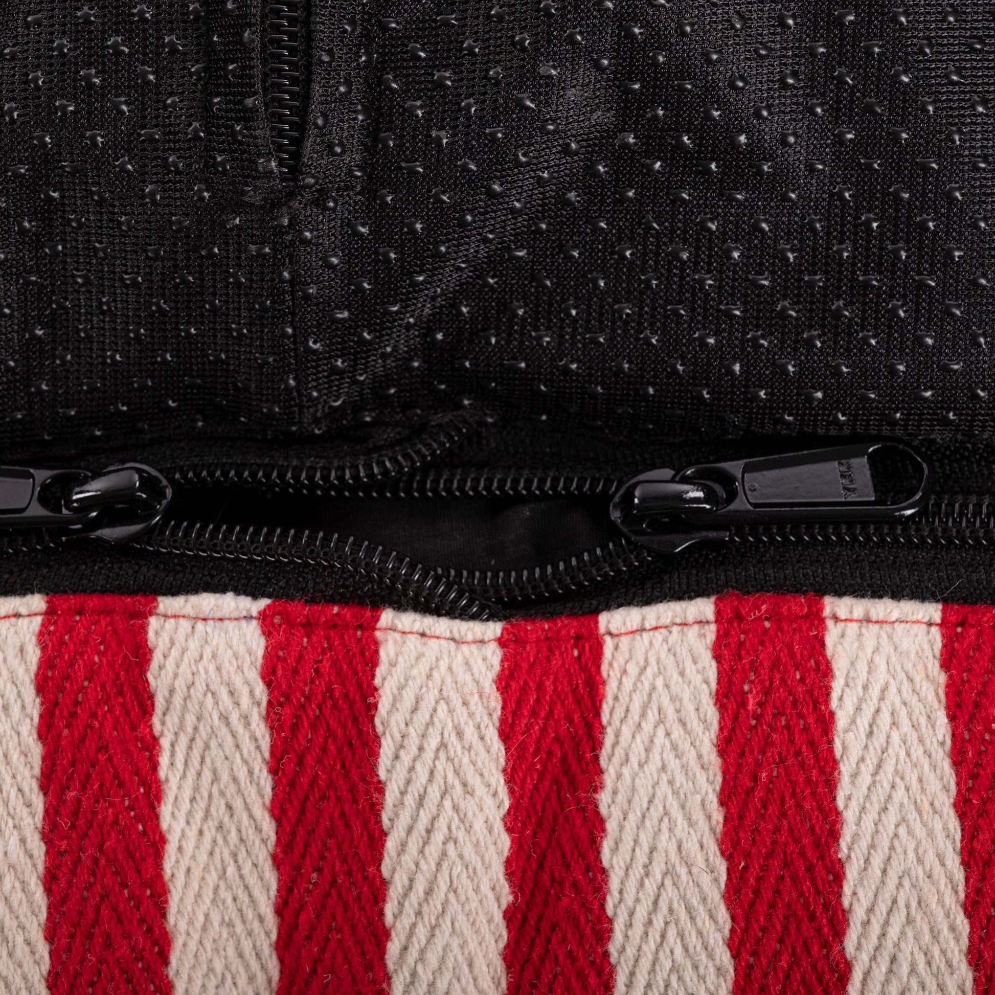 This lounger dog bed is made for the best, restful snoozes. Made with cotton blend fabric in red and ivory stripes, featuring an adorable embroidered teddy bear face, this bed is soft, supportive, and perfect for long naps. The plush microfibre filling and bolstered sides offer cosy comfort, while the anti-skid base keeps it steady. With easy-grip handles, you can carry their cosy spot from room to room, because the best naps always find the sun!