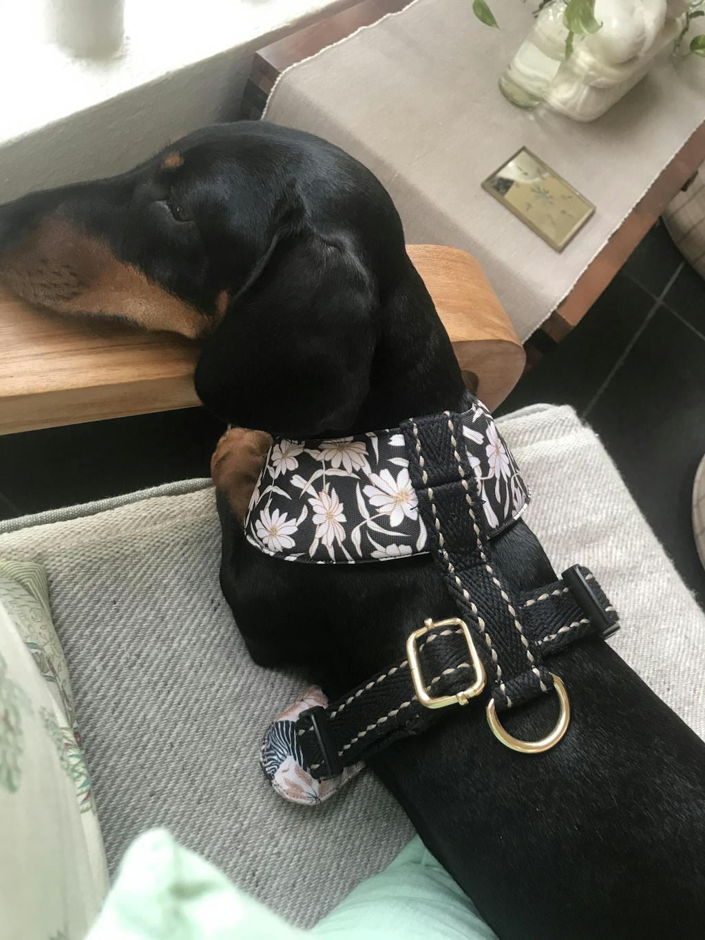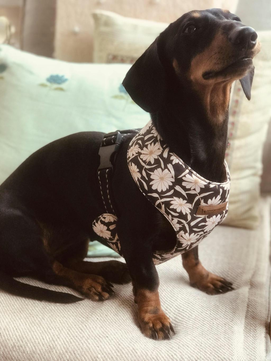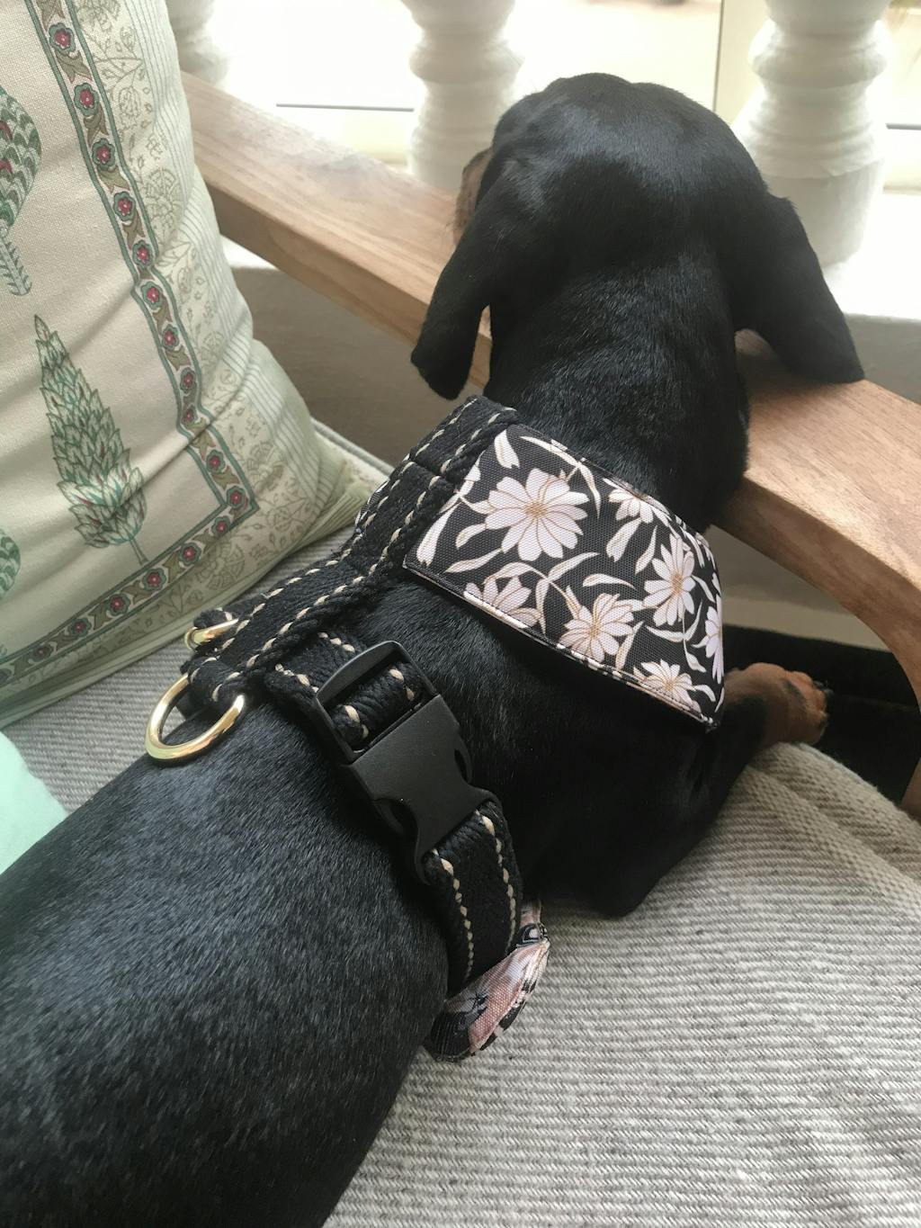 Bells is a 7kg Dachshund rescue, we usually have a challenge trying to find a harness that fits comfortably across her chest and doesn’t rub her front elbows. This harness is perfect! We also love the reversible patterns and all the fabulous details. Bells spends a lot of time at the beach digging and swimming so it’s important it washes well and drys very fast. We will definitely purchase another - Thank you 😊 🙏🐾