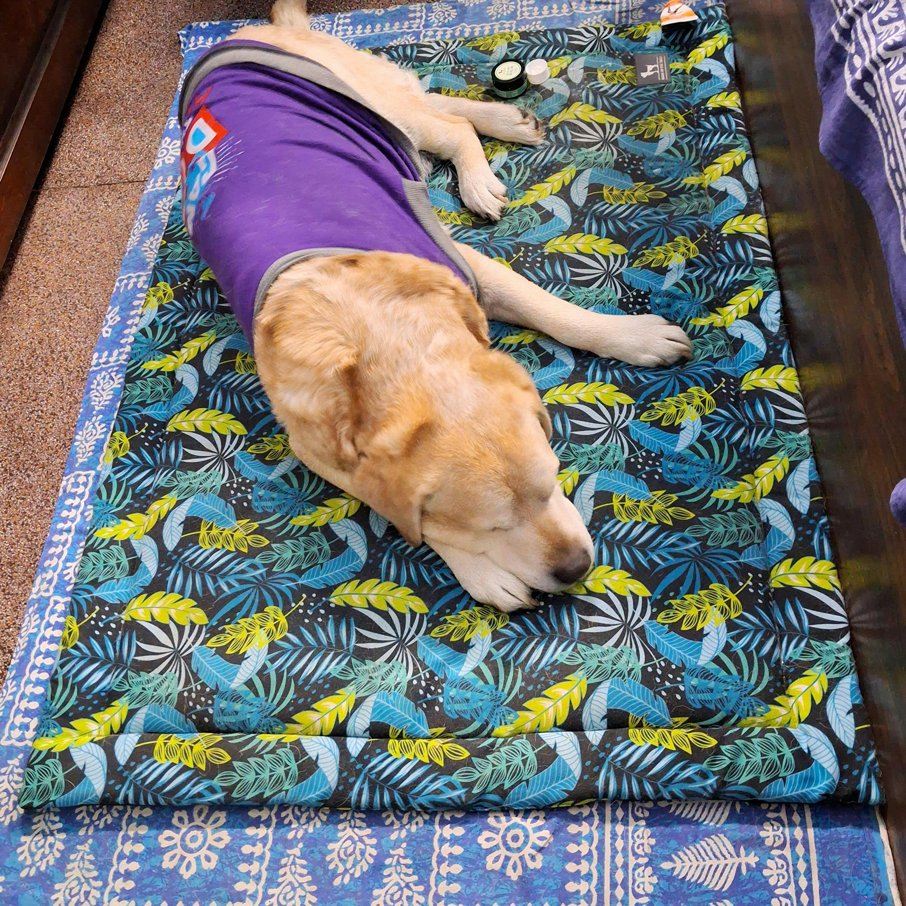 Give your furry friend the perfect place to rest with our stylish and cosy dog mat. Featuring a unique leafy print, this mat not only provides unbeatable comfort but also adds a chic touch to any corner of your home. The durable canvas material is designed to last, while the soft polyfill padding offers ultimate relaxation for your pet. With an anti-skid base to keep it in place, your dog can move around freely without the mat shifting. Plus, the convenient velcro closure at the back allows for easy folding, and side handles make it simple to carry and place wherever you need it. Your dog will love lounging on this mat, and you'll love how it complements your home!