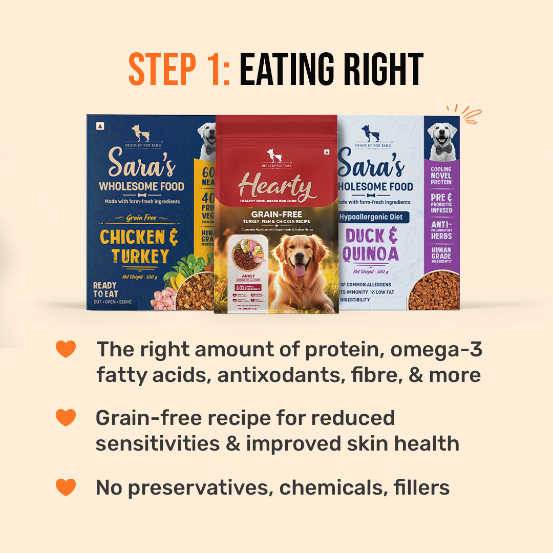 - Sara’s Wholesome Food Grain-Free Home-style Meals (Chicken & Turkey): A home-style meal with the right amount of protein, omega-3 fatty acids, fibre, and more. The grain-free recipe reduces risk of skin irritation, itching, or dullness.