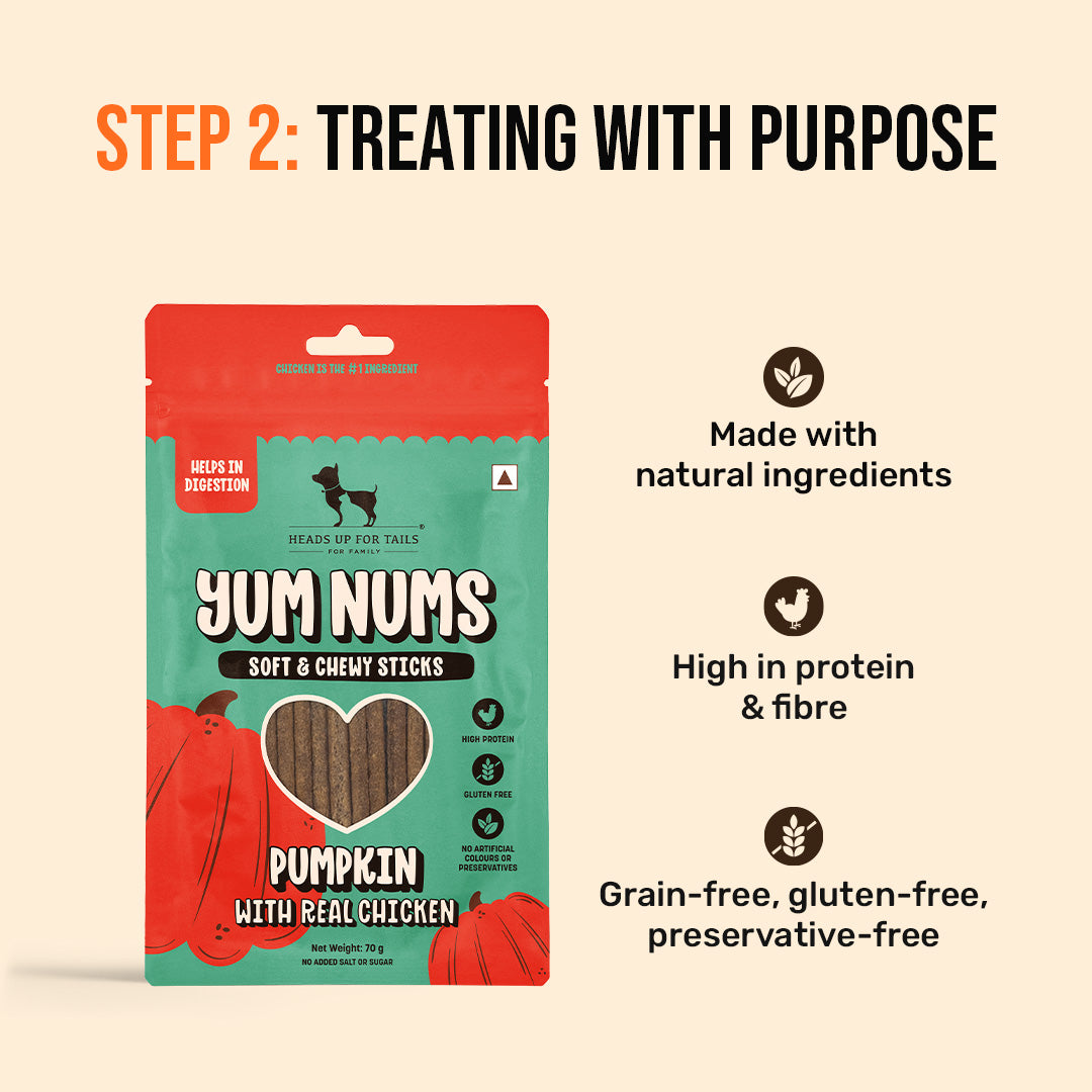- Yum Nums Soft & Chewy Treats (Pumpkin & Real Chicken): A high-fibre, high-protein soft treat that improves digestion, absorption of nutrients, and ultimately, healthier skin and coat.