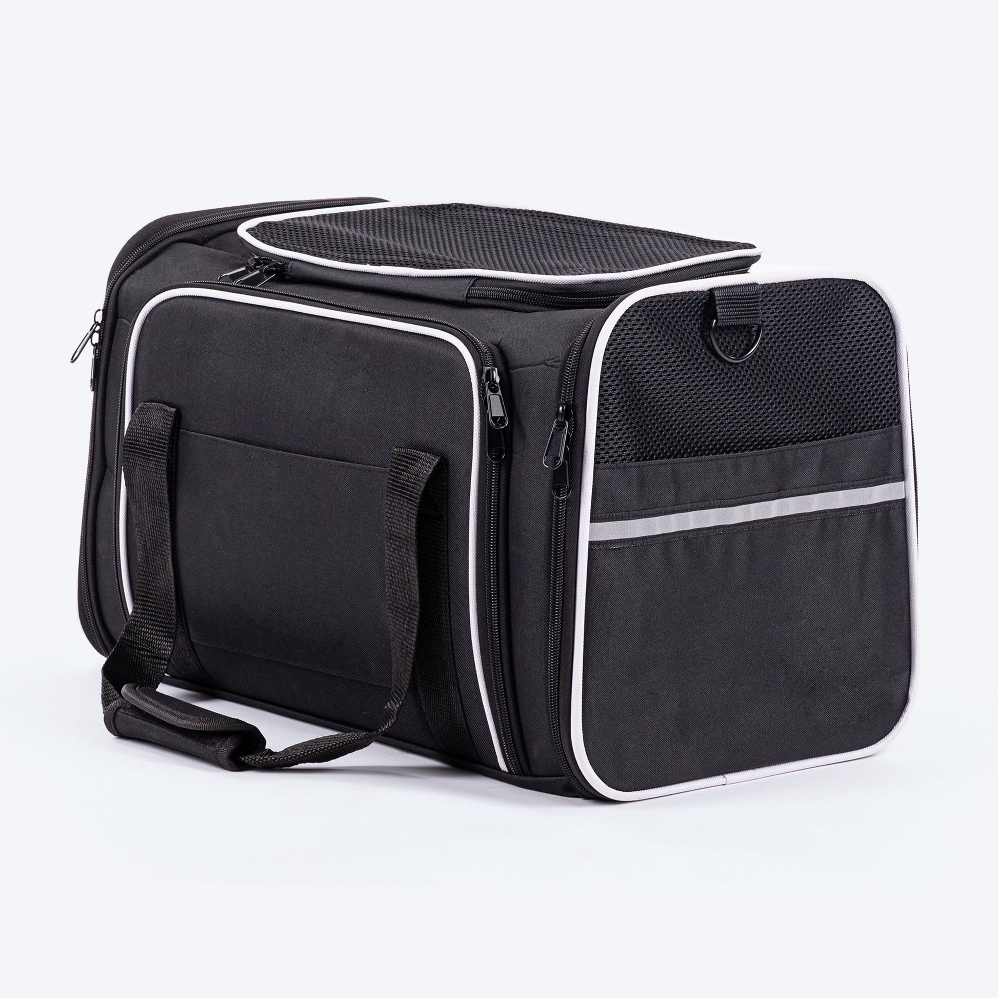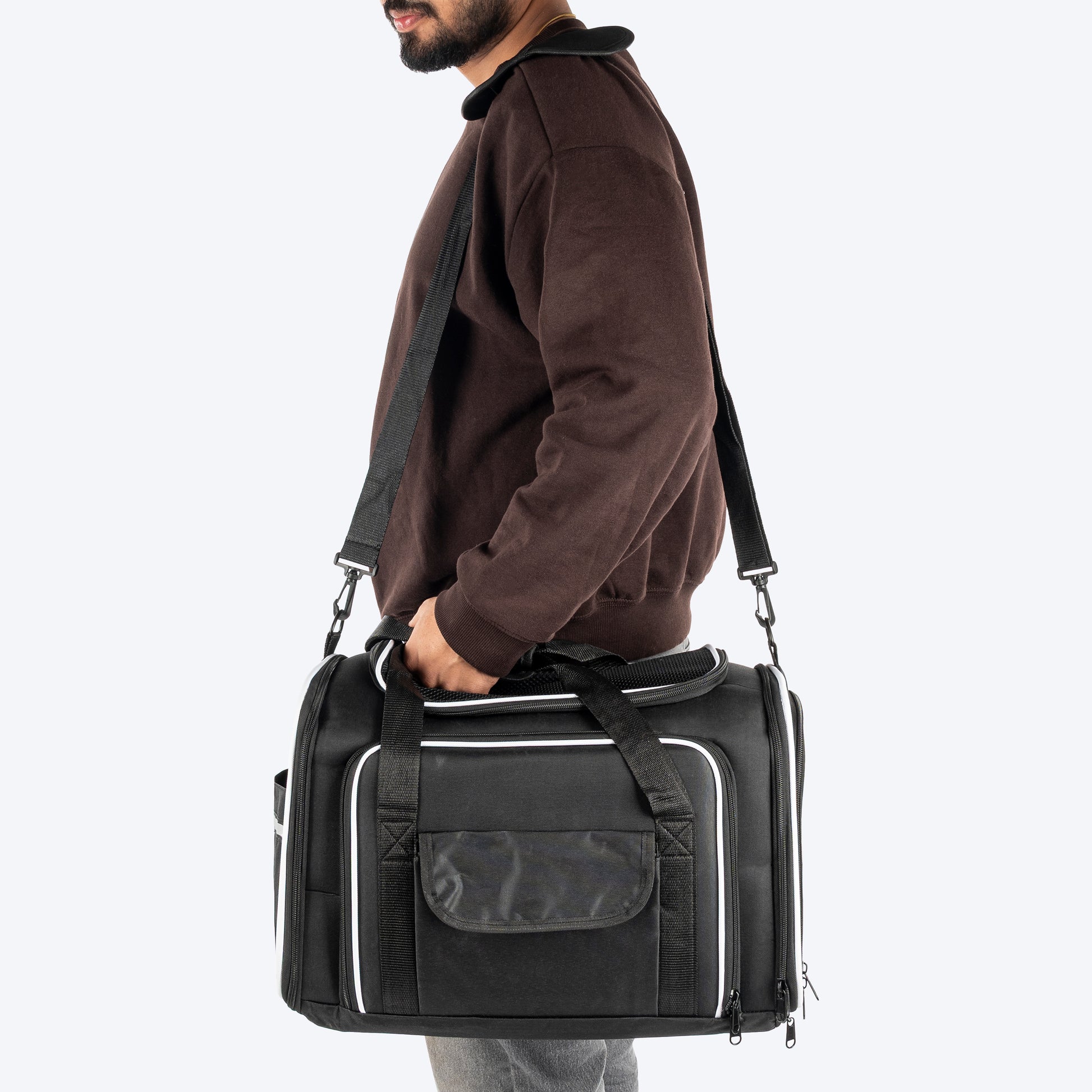 Soft, breathable, and thoughtfully designed, this carrier creates a cosy space for your pet on the move. Mesh windows and see through mesh open roof allow airflow and visibility, while expandable side cabins give your pet room stretch and relax. The duffle-style design sits comfortably on your shoulder, making travel feel effortless. Finished with a shoulder strap and an essentials pocket, it’s made for comfortable travel days.