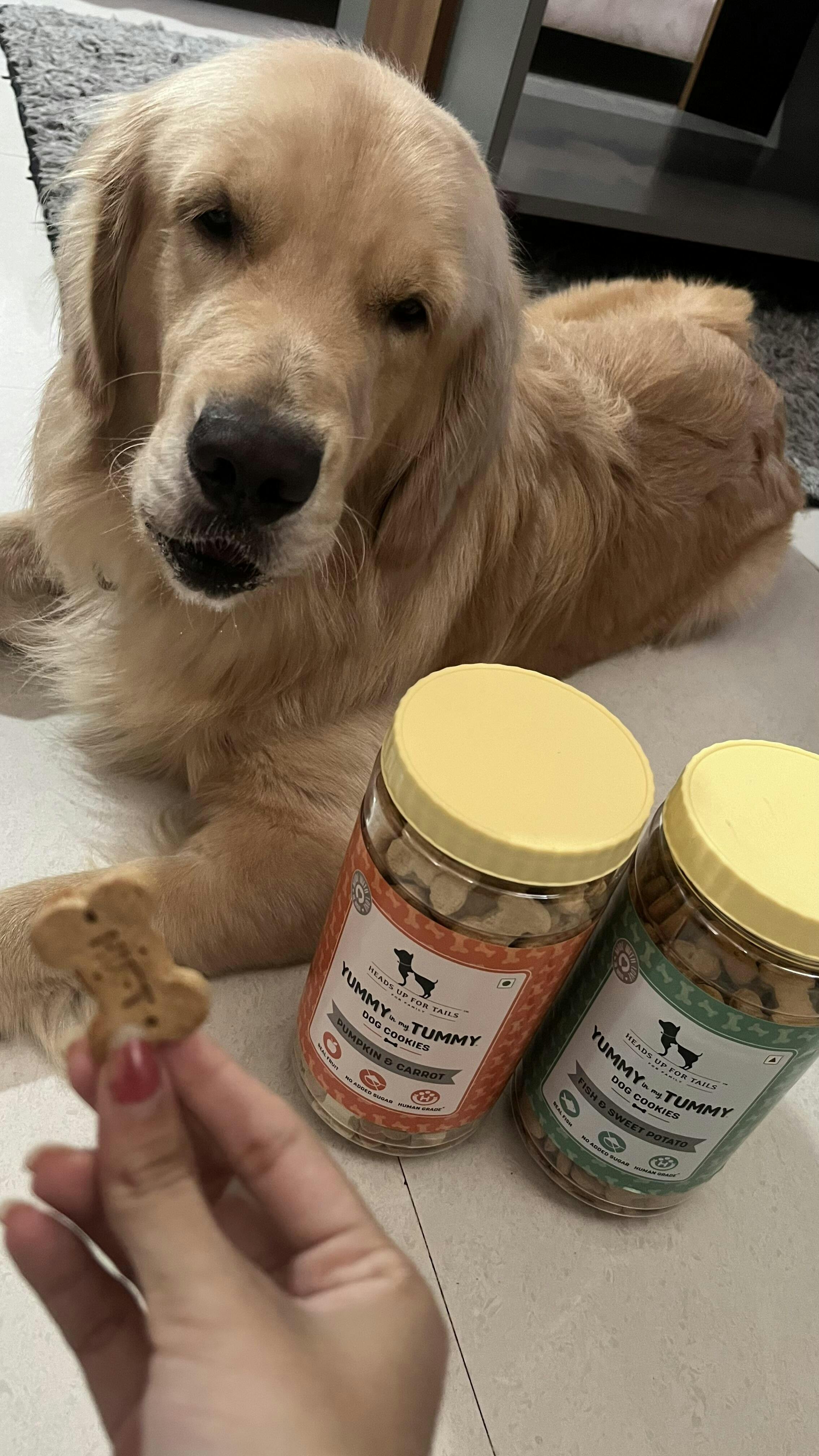 Your search ends here! Health meets taste in HUFT Yummy In My Tummy dog biscuits. Unlike other dog biscuits, ours contain no artificial flavouring or colours, harmful maida (refined flour) or processed sugar. These biscuits are made with only 100% real, human-grade ingredients like hypoallergenic fresh mackerel fish and sweet potatoes, atta (whole wheat flour) and besan (chickpea flour), along with lots of love and care!