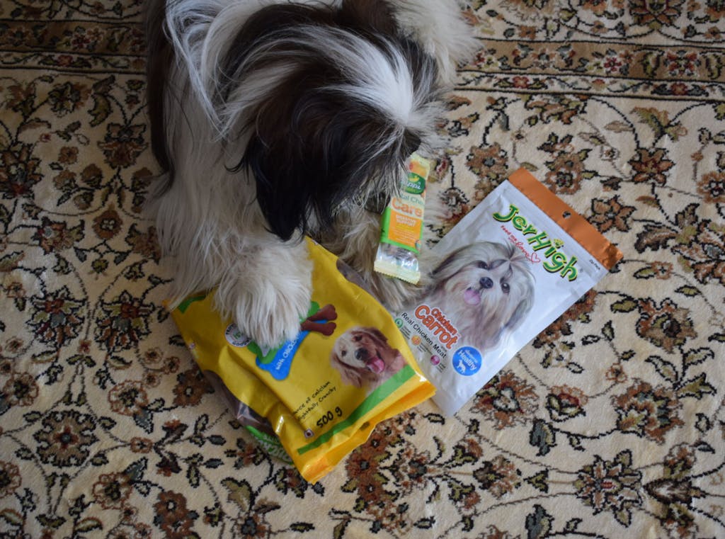 HUFT Tip:' Do not feed your dog human treats as they can be difficult to process and digest. Treats for dogs are made from specific ingredients that are easy to digest and can be processed by your dog's system.