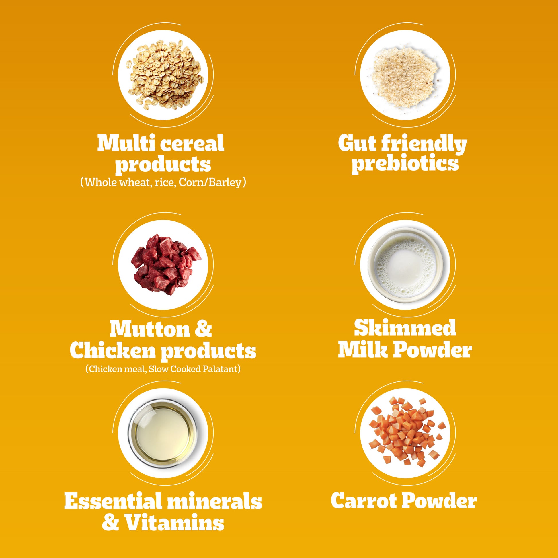 Ingredients: Cereals and Cereal by-products, Chicken and Chicken by-products and Meat and Meat by-products, Soybean Meal, Di-Calcium Phosphate, Potassium Chloride, Iodized Salt, Soybean Oil, Antioxidants, Choline Chloride, Vitamins and Minerals, Milk Powder, Carrot Powder, Peas Powder, Zinc Sulphate Monohydrate, Permitted preservatives & flavours.