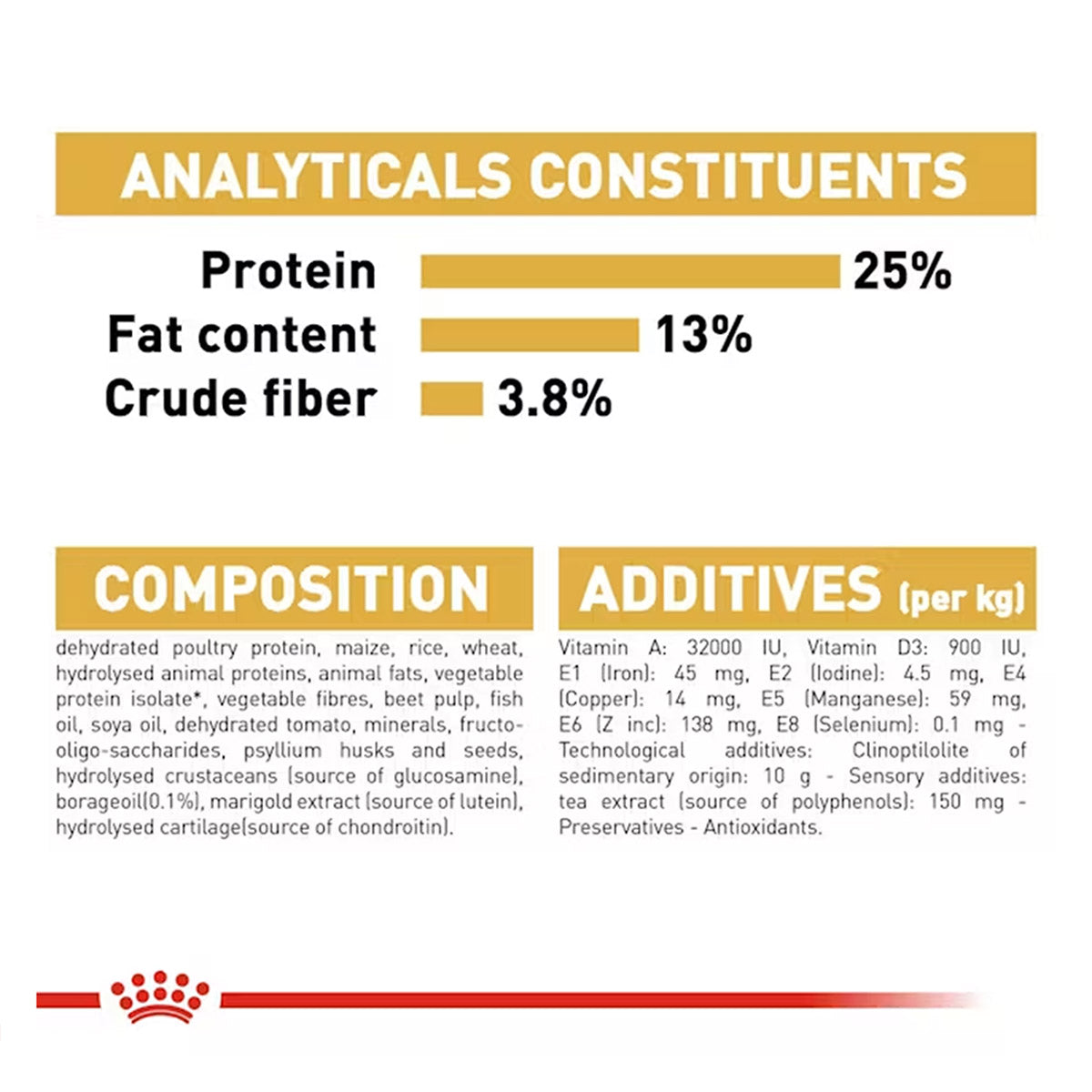 Composition: Dehydrated poultry protein, rice, maize, vegetable protein isolate*, wheat, animal fats, vegetable fibres, hydrolysed animal proteins, beet pulp, fish oil, minerals, soya oil, fructo-oligo-saccharides (0.34%), psyllium husks and seeds, hydrolysed yeast (source of manno-oligo-saccharides), hydrolysed crustaceans (source of glucosamine), borage oil (0.1%), yeasts extracts (source of betaglucans), marigold extract (source of lutein), hydrolysed cartilage (source of chondroitin).