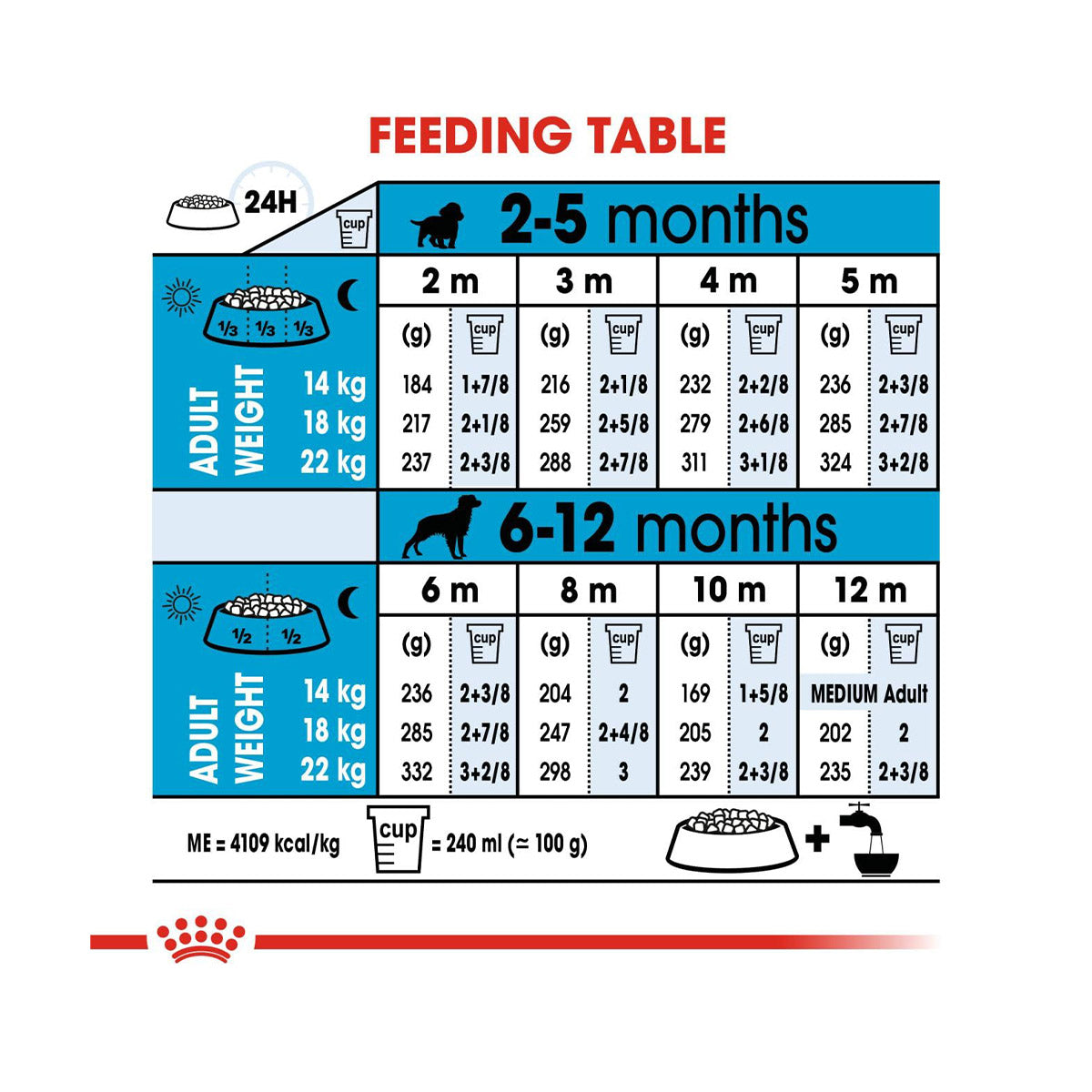 | 12 m | Transition to Medium Adult | Transition to Medium Adult | 202 g (2 cups) | 235 g (2 + 3/8 cups) | 261 g (2 + 5/8 cups) |