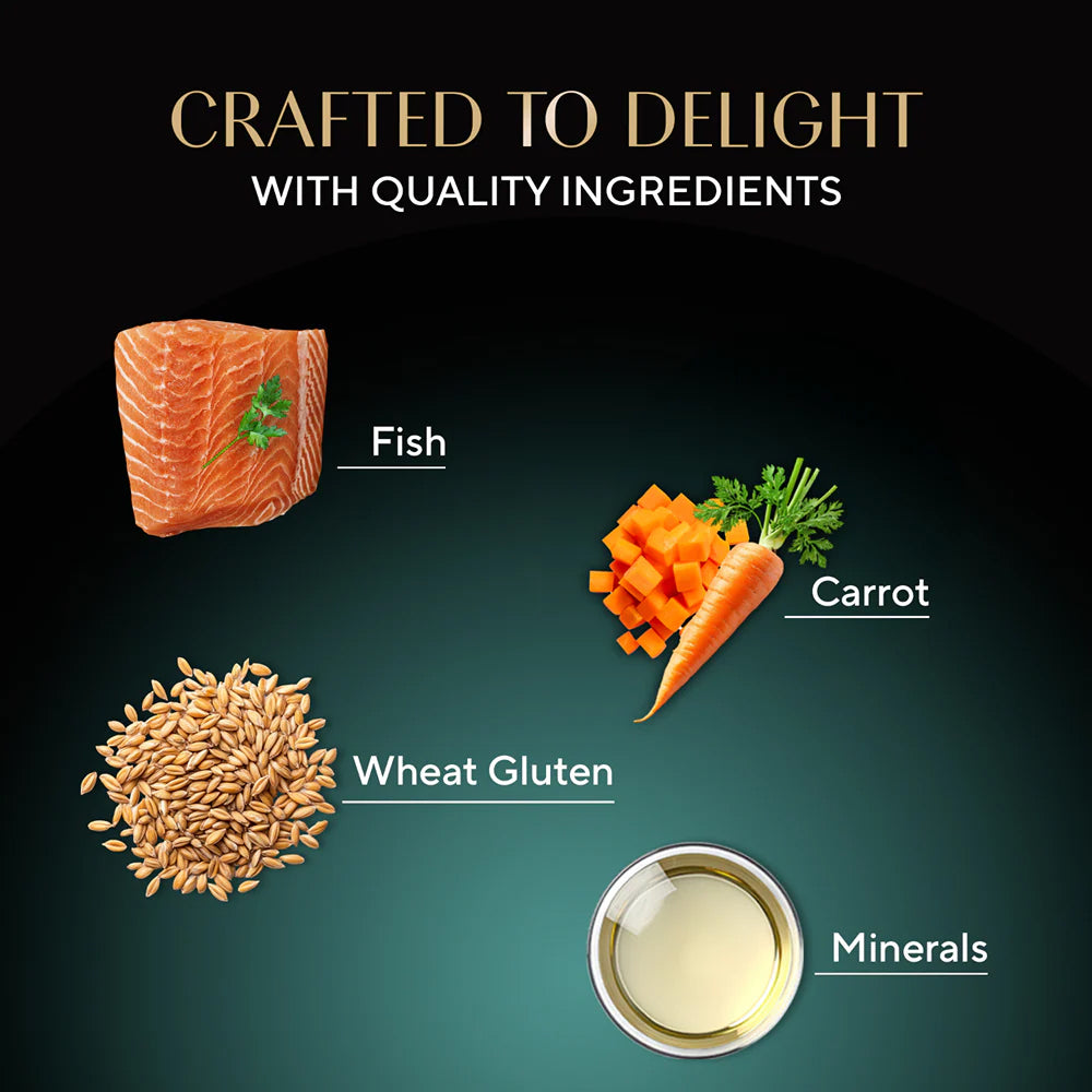 Ingredients: Fish, Flavouring, Modified Starch, Carrot, Wheat Gluten, Gelling Agents, Minerals