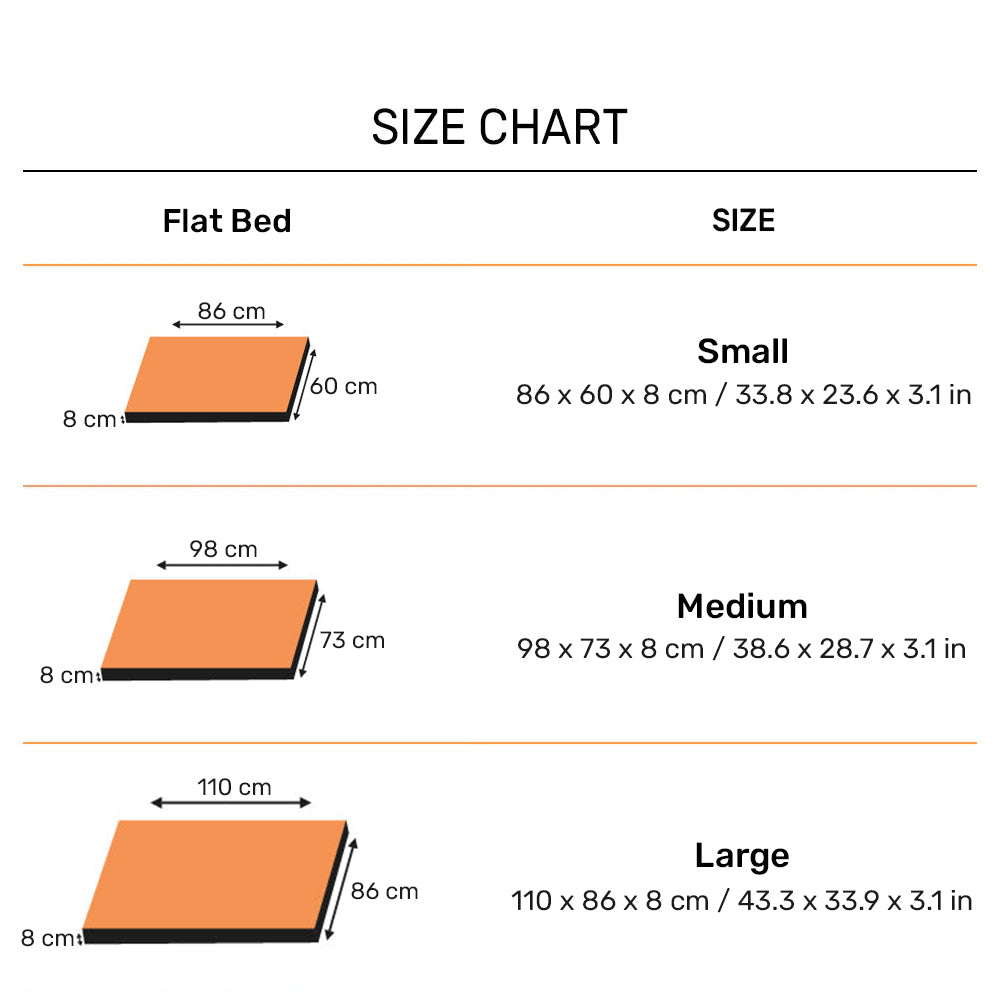 - Measurements: S: 86 × 60 × 8 cm; M: 98 × 73 × 8 cm; L: 110 × 86 × 8 cm.