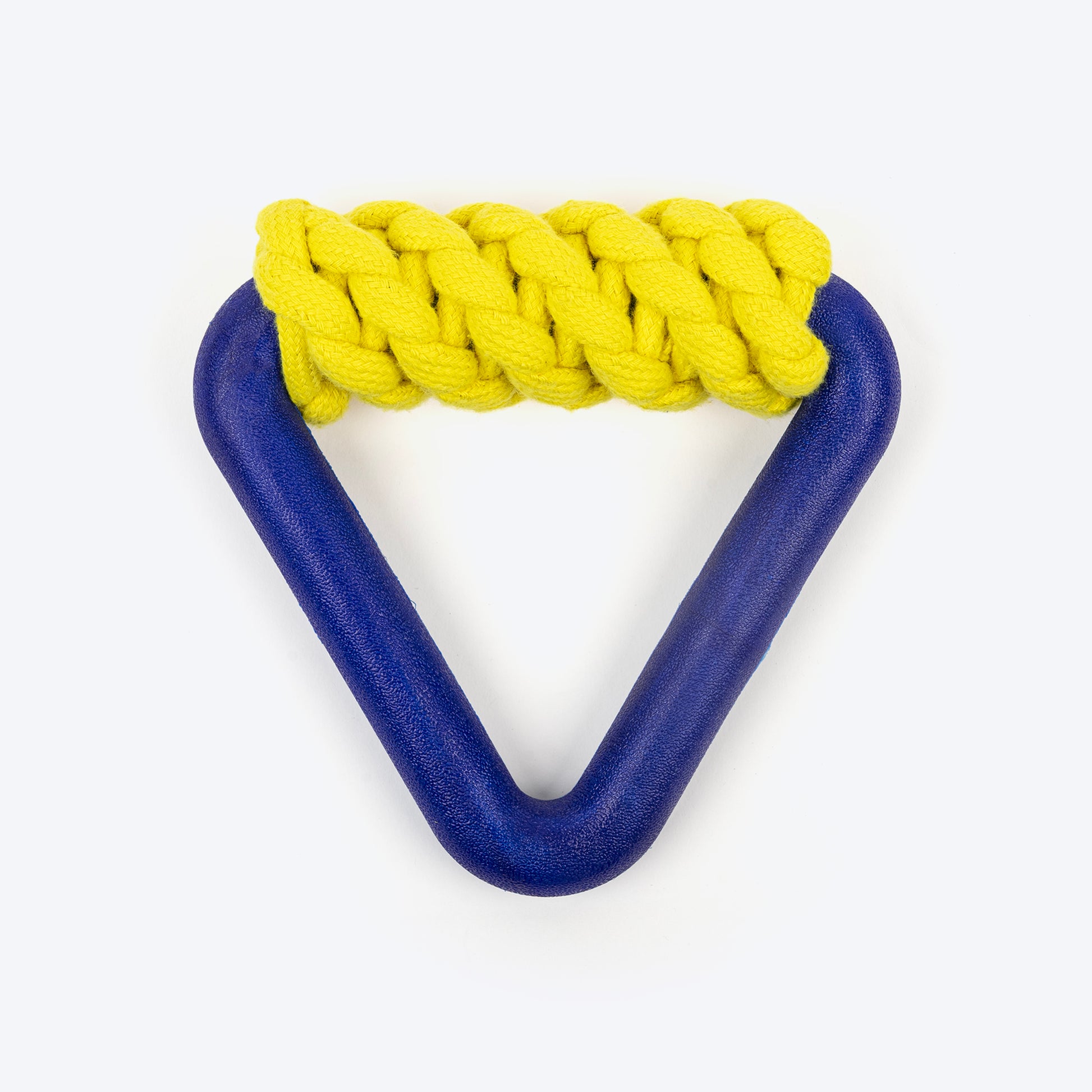 Featuring a triangular handle with a braided yellow rope loop, this chew toy is built for interactive play. Dogs can grip the handle while tugging or chew on the rope for a satisfying texture. The reinforced core means it can withstand spirited tug‑of‑war matches without losing its shape. It’s like a gym workout for your dog, minus the membership fees!