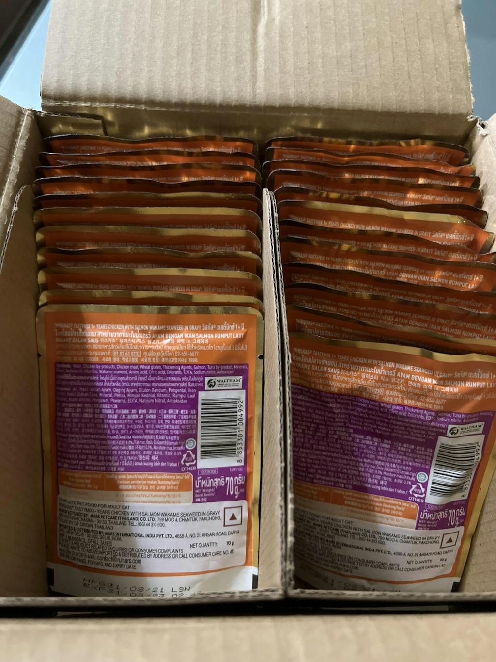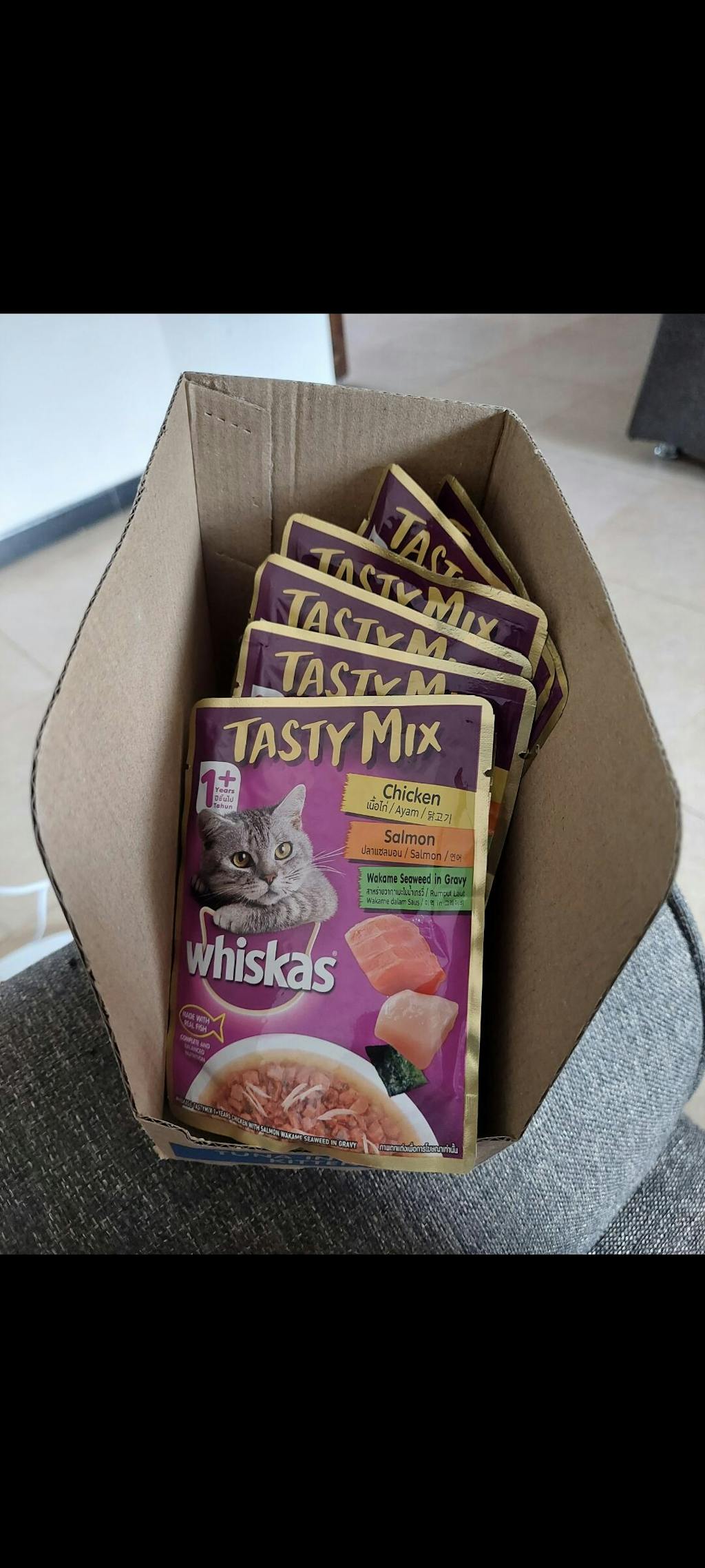 - Product Name: Whiskas Tasty Mix Wet Food Made With Real Fish (Salmon & Wakame Seaweed) With Chicken in Gravy For Adult (1+ year) Cat - 70 gm Pack