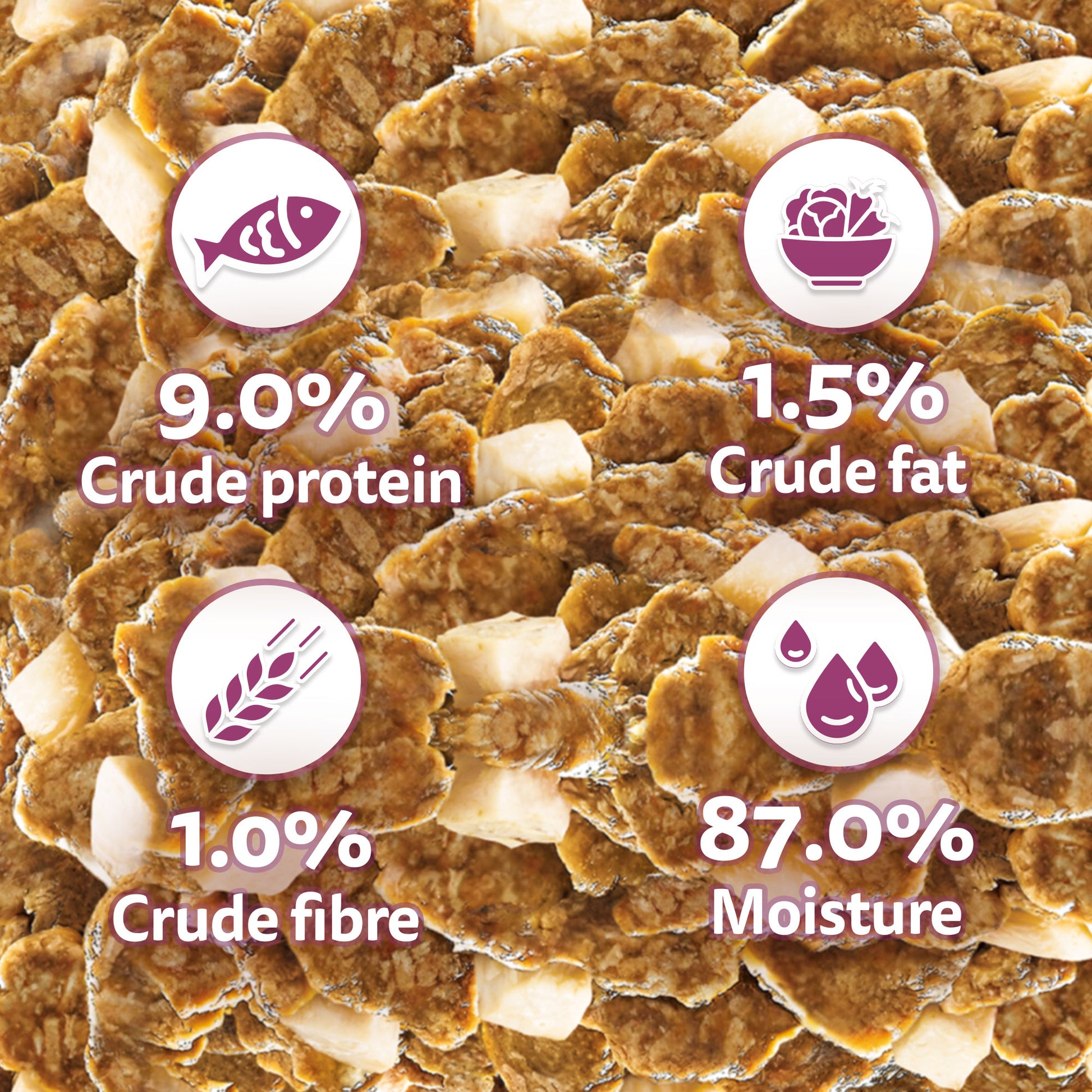 Analytical Constituents (%):‚ Protein 8%, Fat 4.7%, Moisture 84%, Fibre 0.3%, Ash 1.7%